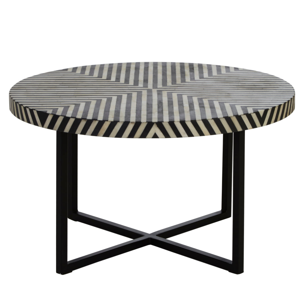 The Bala Cross Base Coffee Table features a durable black metal cross leg base and a sophisticated acacia wood top with intricate black and white bone inlay designs, adding a chic touch to any living space and complementing various boho decor styles.