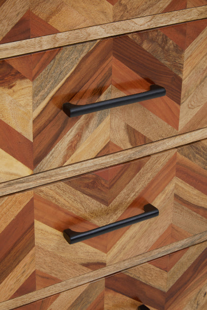 This five drawer chest beautifully blends natural mango wood with sturdy black iron legs, creating a contemporary look with an industrial edge. Ideal for ample storage, it adds both function and style to any room.
