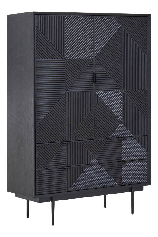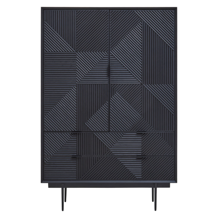 The Jamila Black Large Cabinet seamlessly blends eye catching design with practicality, showcasing a carved wood texture that emphasises abstract geometric motifs. Its deep black hue contributes a touch of elegance, while the streamlined metal base and legs ensure both stability and a modern touch. Ideal for decluttering your environment, this cabinet elevates any contemporary interior with its refined appearance.