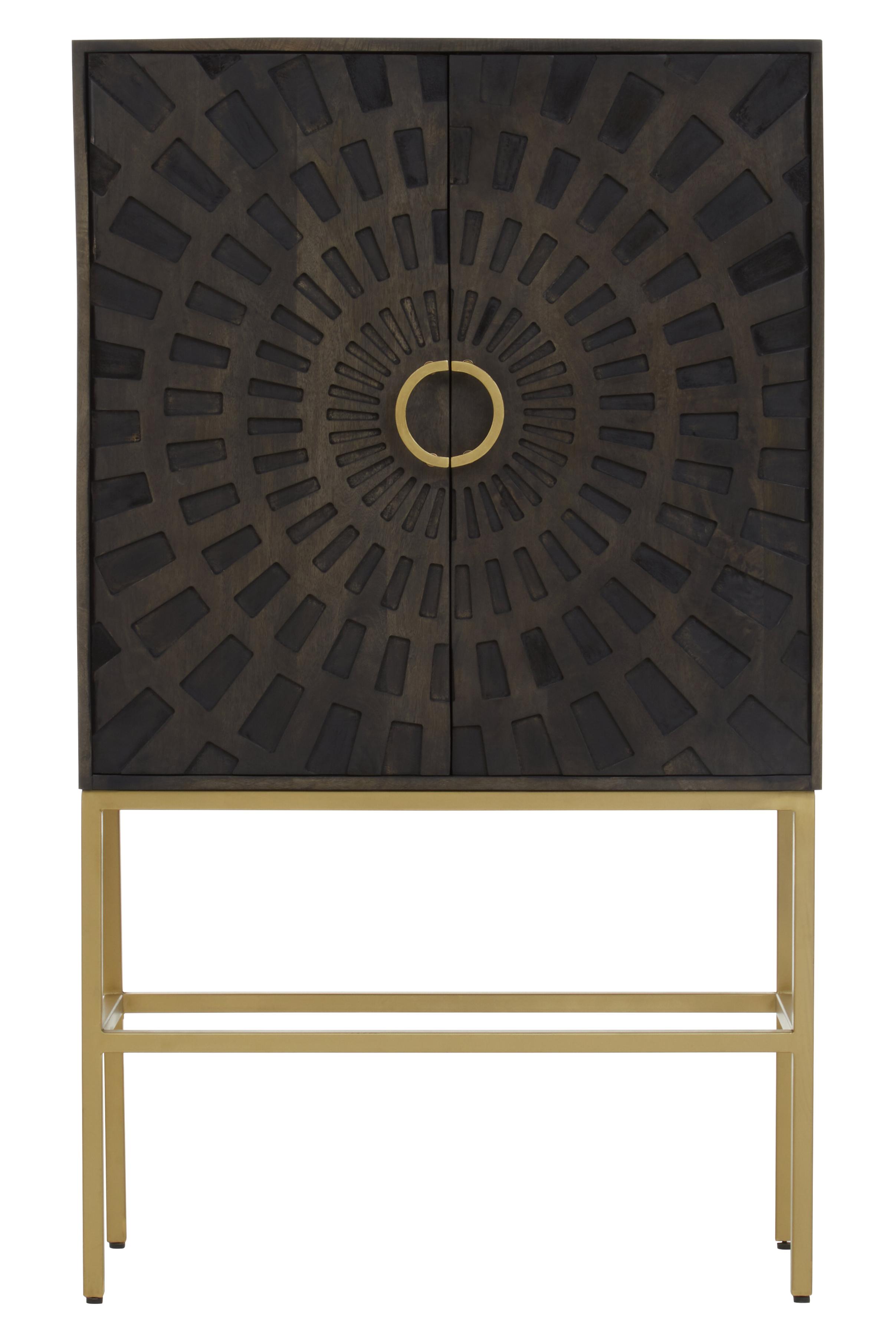 This two-door cabinet features a beautiful brown mango wood construction, enhanced by a slim gold finish on its metal legs. The front displays an eye-catching embossed sunburst design, while the doors are adorned with small rectangular carvings that are perfectly paired with sturdy metal handles.