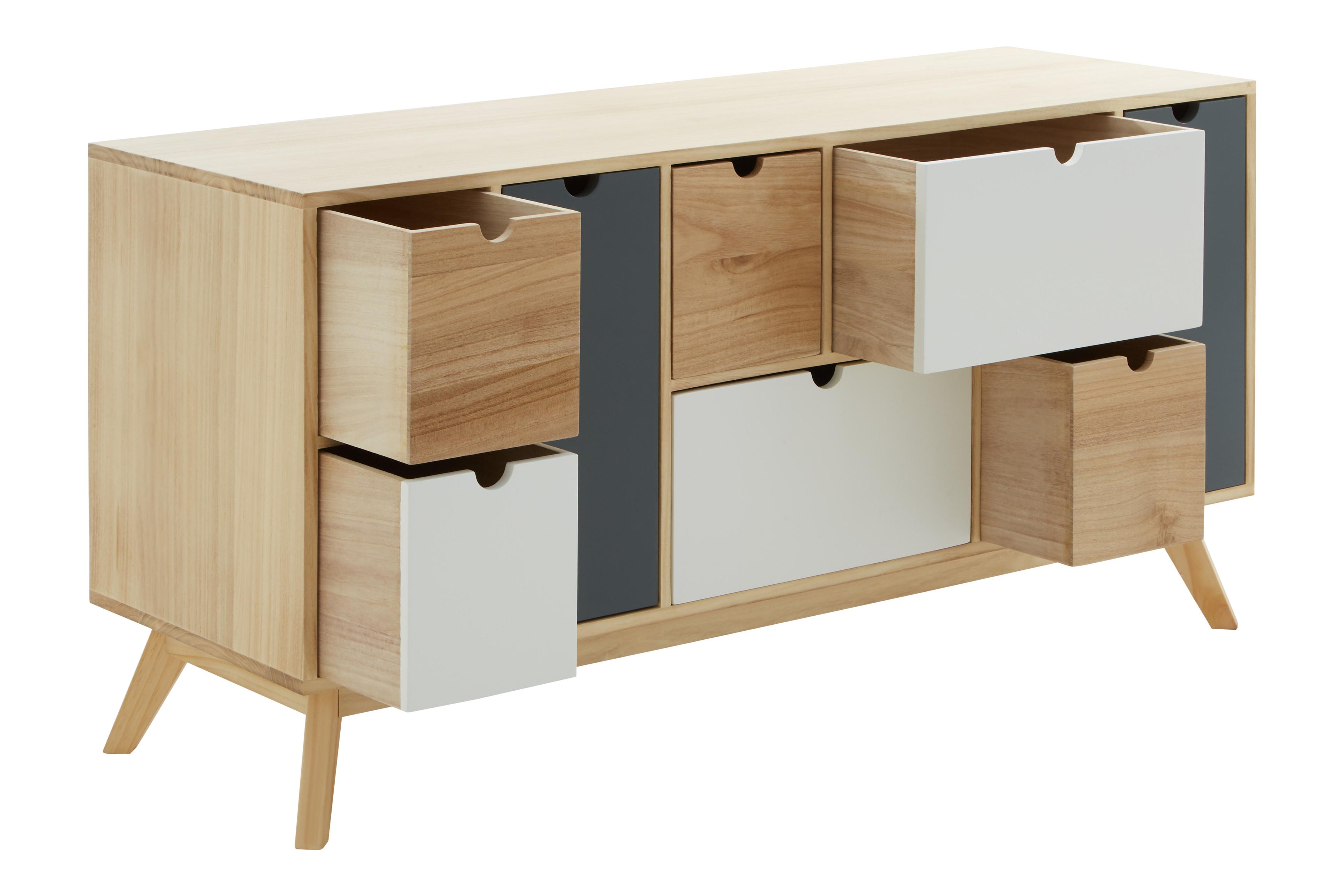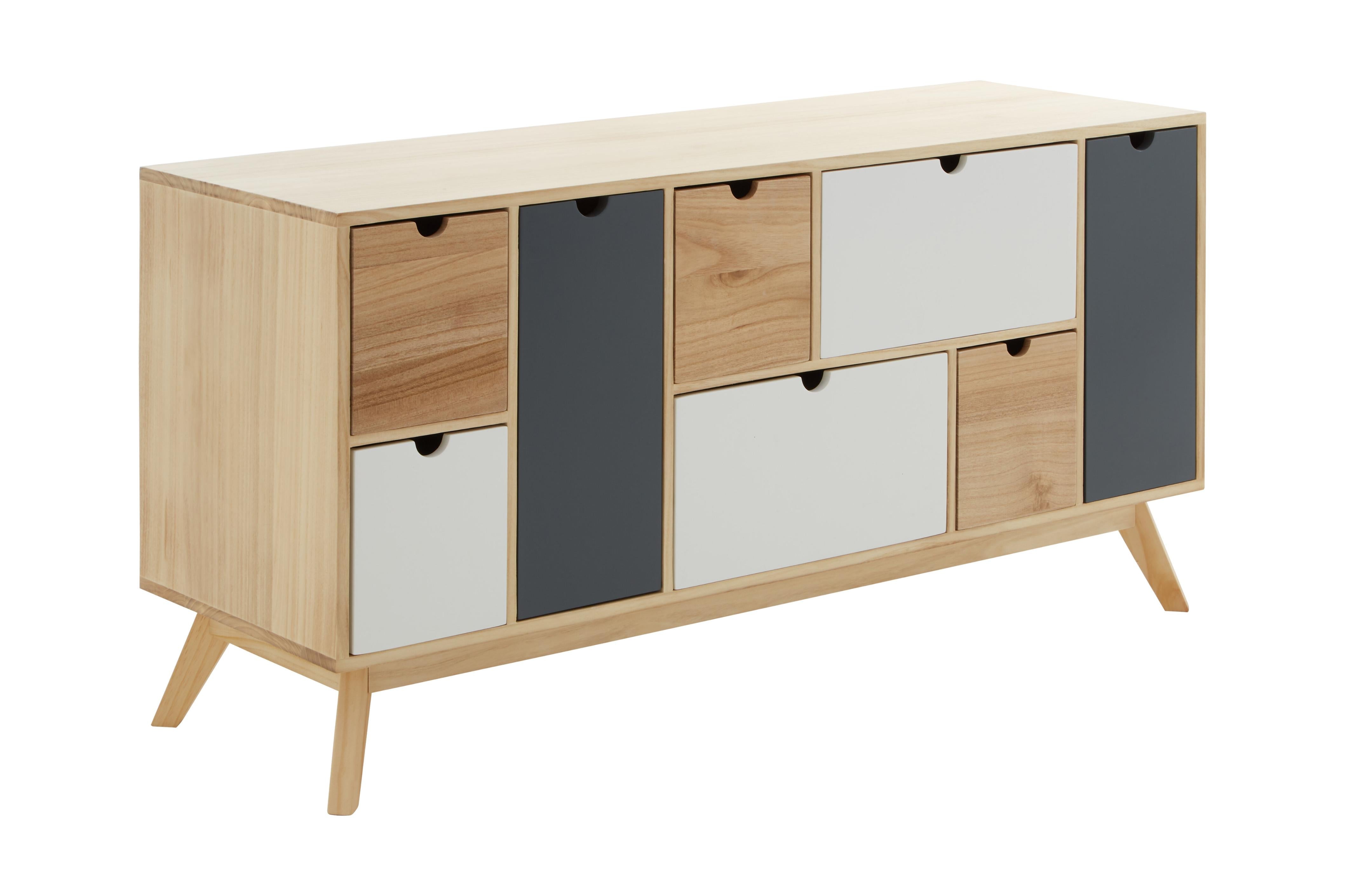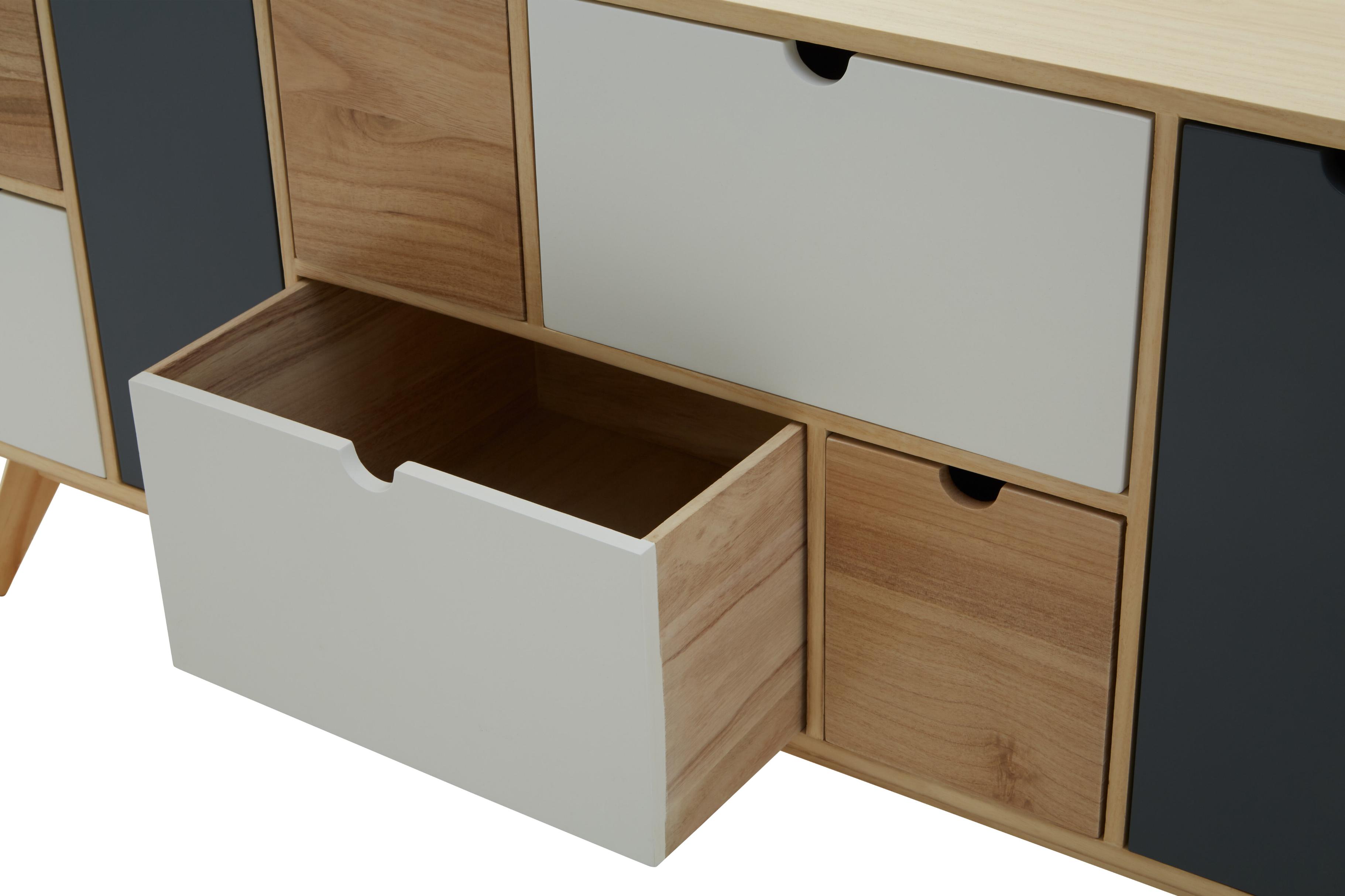 This Scandinavian-style chest features a two-tone design with six drawers and two doors, combining grey and white fronts with a natural wood finish. The drawers are designed with sleek cut-out handles, enhancing the minimalist aesthetic, while the angular legs give the piece a mid-century modern appeal. Each drawer opens to reveal ample storage space, making this chest both stylish and functional for any room in your home.